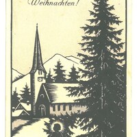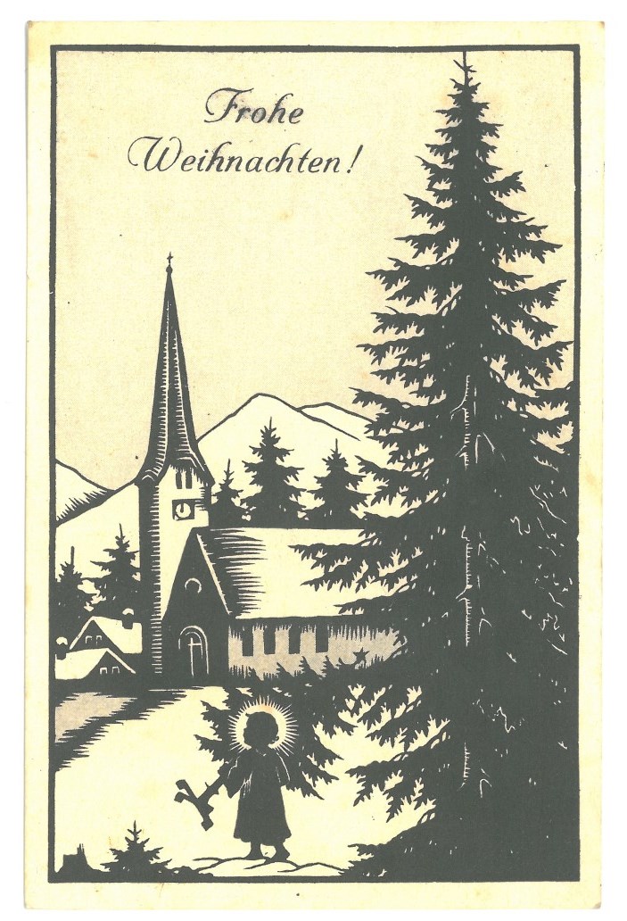 Scherenschnitt von Josefine Allmayer; Engel mit Christbaum vor einer Kirche;