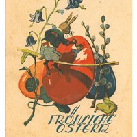 - Poskarte "Fröhliche Ostern" mit farbigem Motiv des Osterhasen, Eiern, Küken, Osterglöckchen und Weidenkätzchen