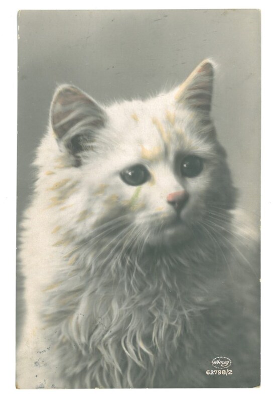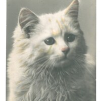 Motiv: s/w Foto von weißer Katze; Nase und Ohren leicht rosa coloriert;