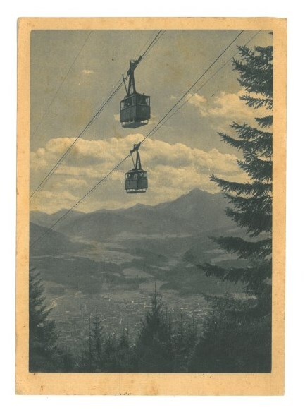 Schwarzweißfotografie der Innsbrucker Nordkettenbahn, Wagenkreuzung