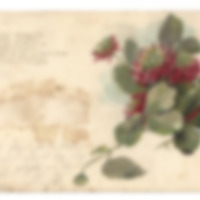 - Postkarte mit Blumen und Glitzer,; auf der Vorderseite der Karte wurde etwas Aufgeklebtes abgerissen; Am rechten oberen Rand sind einzelne Buchstaben angeführt