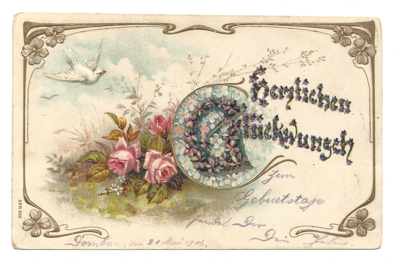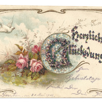 Postkarte mit rosa Rosen, Taube und Blumenschriftzug gemalt, geprägt;