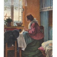 Postkarte; Farbbild einer Frau am Fenster beim Sticken und Baby in der Wiege; Abgestempelt (Ort und Zeitpunkt nicht lesbar)