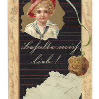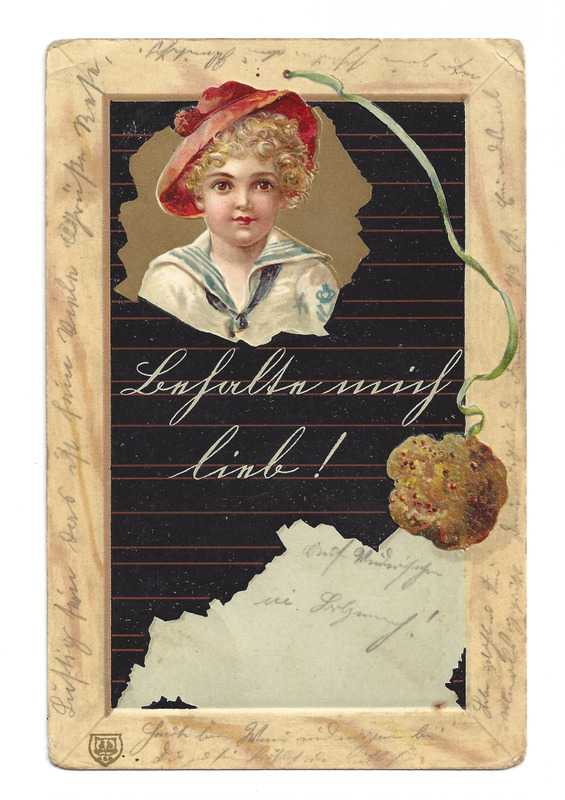 Postkarte; geprägte Collage; betitelt mit "Behalte mit lieb!"; Abgestempelt in Hittisau am 1902-07-21
