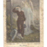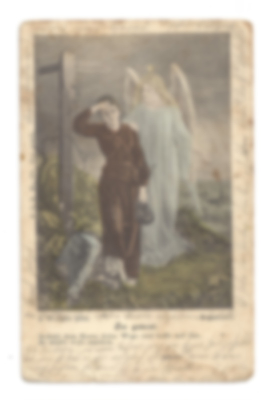 Das Bild der Postkarte zeigt eine Frau, die an einer Wegkreuzung steht und der ein Engel die Hand auf die Schulter gelegt hat. Der Engel scheint mit seiner anderen Hand, der linken, auf die Kirche im Hintergrund zu deuten. Das Gras und die beiden Dargestellten sind coloriert. Der Text der Absenderin ist sehr schwierig zu lesen, da die Schrift mit Bleistift sehr verblasst ist. Die Poststempel sind ebenfalls kaum zu erkennen, die Briefmarke wurde abgelöst.