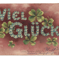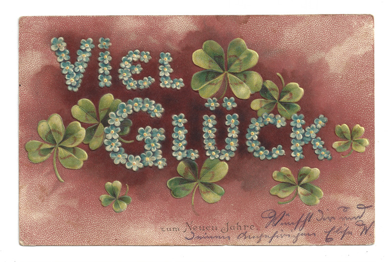 Die Postkarte hat auf der farbigen Bildseite geprägte Kleeblätter und ein aus blauen Blumen bestehendes "Viel Glück". Die Briefmarke wurde abgelöst, der Poststempel ist zur zur Hälfte zu lesen.