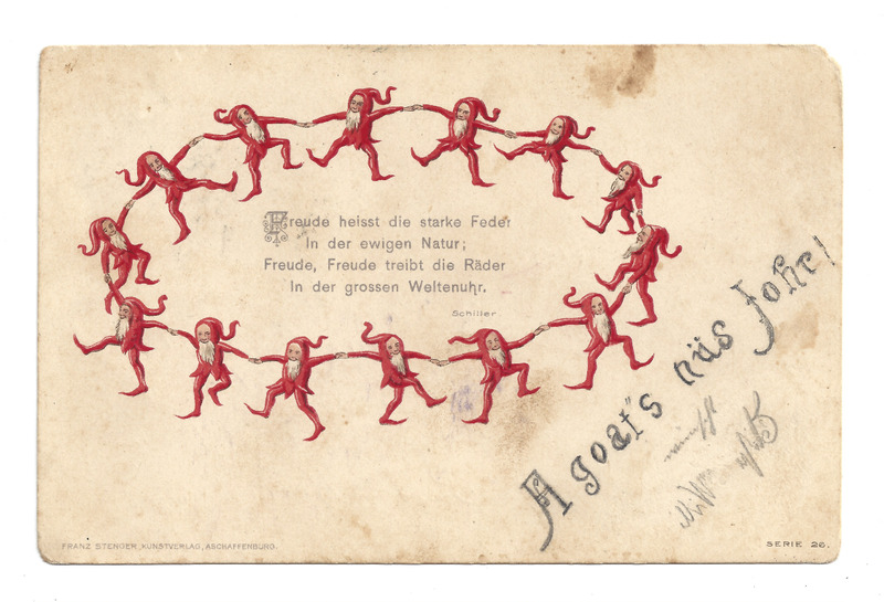 Um das vorgedruckte Gedicht auf der Bildseite tanzen kleine Männchen mit weißem Bart und rotem Gewand, die sich an den Händen halten. Die Briefmarke wurde abgelöst, der Poststempel ist gut lesbar. Die Karte hat - aufgrund des Dialekts - wohl jemand aus dem Mittelbregenzerwald geschrieben.