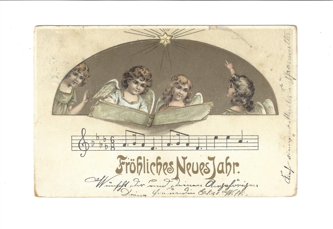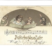 - Postkarte; Farbillustration von Engeln und Musiknoten; betitelt mit "Fröhliches Neues Jahr."; Abgestempelt Hittisau (Zeitpunkt nicht lesbar)