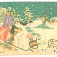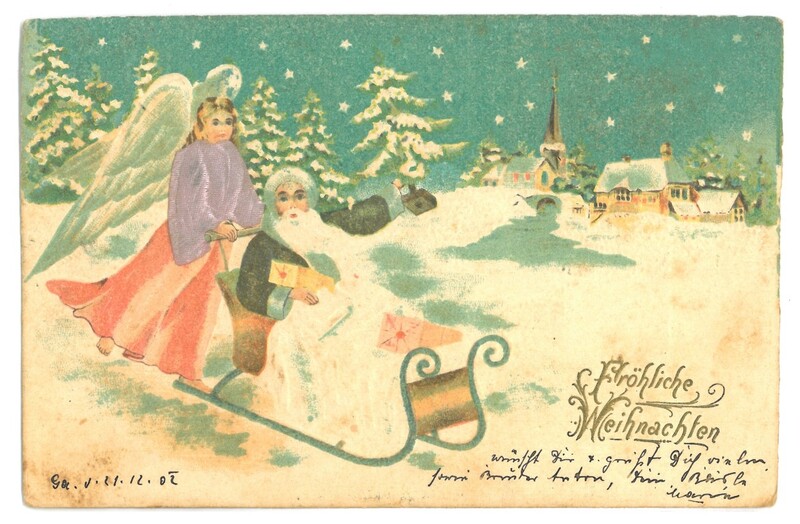 - Colorierte Postkarte mit Prägungen und aufgeklebtem Stoffstück.