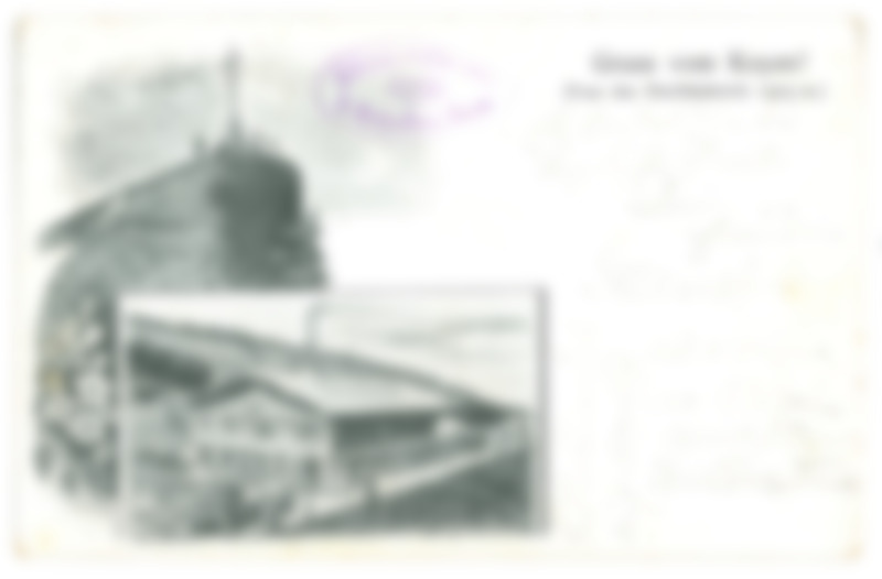 Postkarte "Gruss vom Koyen!", mit Illustration des Gasthauses "Koyenwirtschaft" am Fuß des Hochhädrichs sowie dem Gipfel mit Gipfelkreuz in schwarzweiß; gestempelt auf der Vorderseite von der Koyenwirtschaft b. Riefensberg