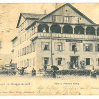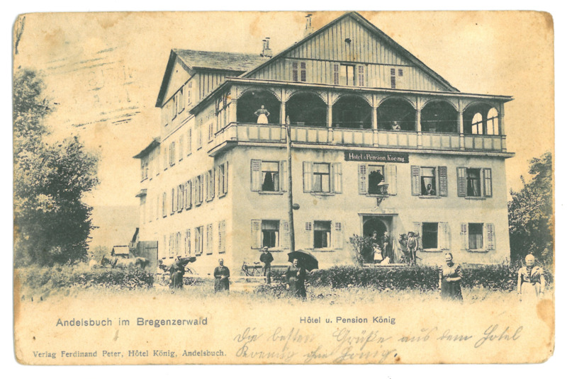 - Korrespondenz-Karte mit Ansicht des Hotels & Pension Koenig in Andelsbuch, schwarzweiß Fotografie; auf der Vorderseite beschriftet; gestempelt in Hittisau ua