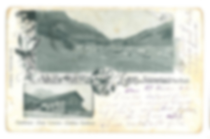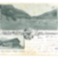 Postkarte; mit schwarz-weiß Fotografien von Schönenbach und dem Gasthaus "Zum Löwen" (Gallus Greber); betitelt mit "Gruss aus Schönenbach Post Bizau"; Abgestempelt (Ort und Zeitpunkt nicht lesbar)