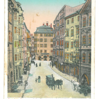 - Farbige Postkarte; mit kupferfarbigen Aufdruck; Motiv: Innsbruck, Herzog Friedrichsstraße; Sämtliche Fenster sind mit einer kupferfarbigen Schicht versehen