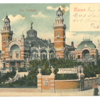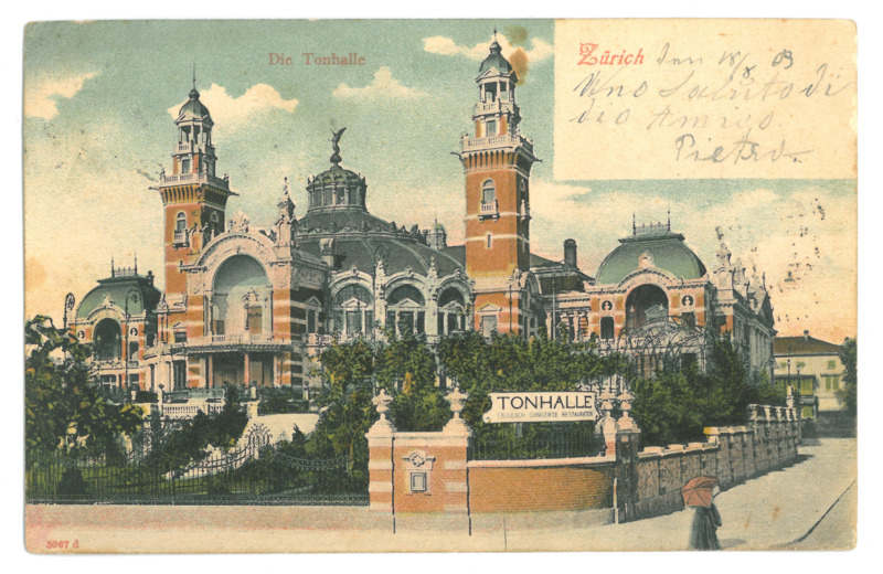 - Farbige Postkarte; mit handschriftlichen in Italienisch geschriebenen Zeilen; Motiv: Tonhalle in Zürich; Rote 10 Franco Briefmarke mit 3 Poststemplen; Zürich und Hittisau