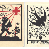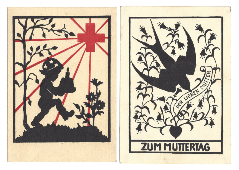 01: 1-fbg. schwarze Karte zum Muttertag; Motiv: Scherenschnitt, Blumenranken und Taube mit Zettel im Schnabel mit dem Text "Der lieben Mutter";