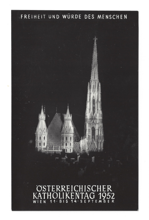 Postkarte des Katholikentag 1952 in Wien; mit Schwarzweiß-Fotografie vom Stephansdom; keine Adresse und kein Absender angeführt; nicht gestempelt aber frankiert