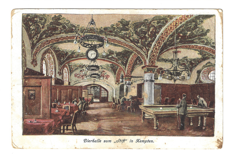 Postkarte der Bierhalle zum Stift in Kempten; gemalt