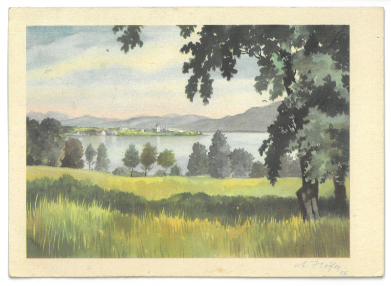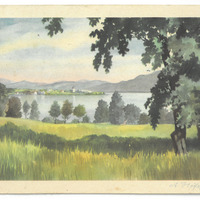 - Postkarte; zeigt eine Wiese und dahinter einen See