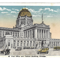 - Postkarte aus Chicago; gezeichnet sind das Post Office und das Federal Building;