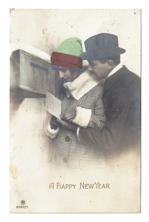 Motiv Vorderseite: Pärchen steht vor einem Briefkasten mit Karte in der Hand. Er hat einen Hut auf, sie eine grün-braune Mütze; Links unten befindet sich eine Nummer: 6082/1;