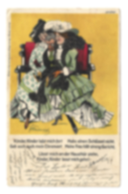 Postkarte mit Farbillustration auf der Vorderseite, Motiv: kleiner Mann mit zwei Frauen auf der Bank, in enger Umarmung, mit vorgedrucktem Spruch, sexistische Wirkung. Auf der Vorderseite beschrieben; gestempelt in Chicago und Krumbach