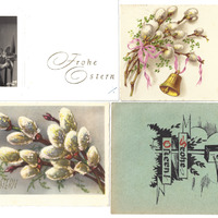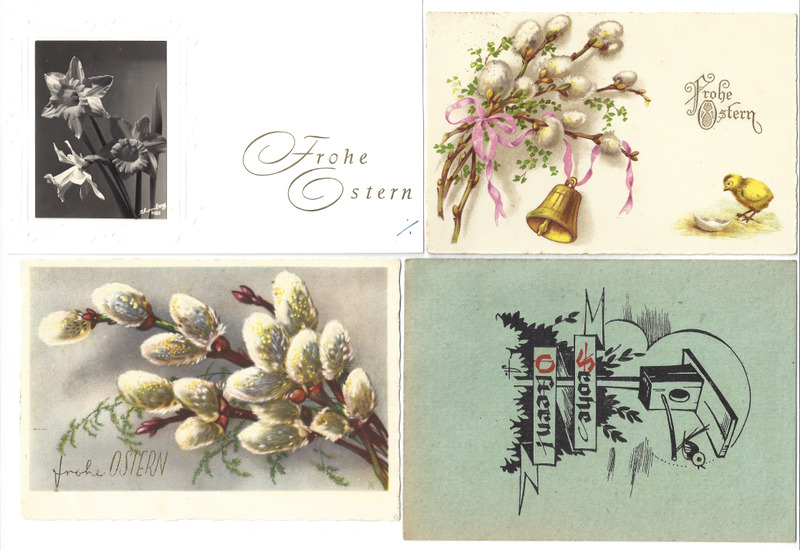 05: bunte Zeichnung von Weidenkätzchen; darunter ist in Gold "frohe OSTERN" aufgedruckt; Abgestempelt am 1950-04-06 in Kennelbach; eine 5-Groschen- und eine 10-Groschen-Briefmarke (Steiermark Salzkammergut); Auf der Adressenseite ist oben "____ksache" hingeschrieben (könnte eventuell "Drucksache" heißen);