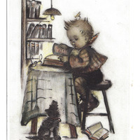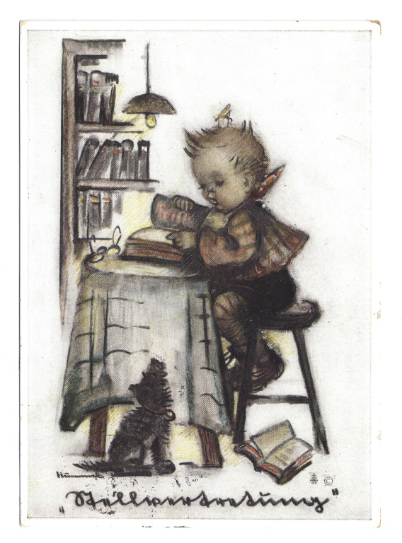 Postkarte; Die Bildseite hat eine bunte Zeichnung von einem Kind am Tisch, das in einem Buch blättert; Abgestempelt wurde die Karte am 1940-05-28 in Bregenz; Briefmarke des Deutschen Reiches; An den Rand des Nachrichtentext ist etwas geschrieben, vermutlich in Steno;