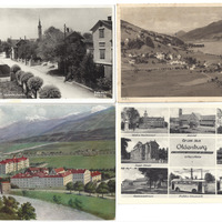 02: schwarz-weißes Foto einer Straße in Höchst; im Hintergrund ist der Kirchturm zu sehen; Abgestempelt am 1934-04-16 in Gaissau; 12-Groschen-Briefmarke (Traunsee);