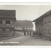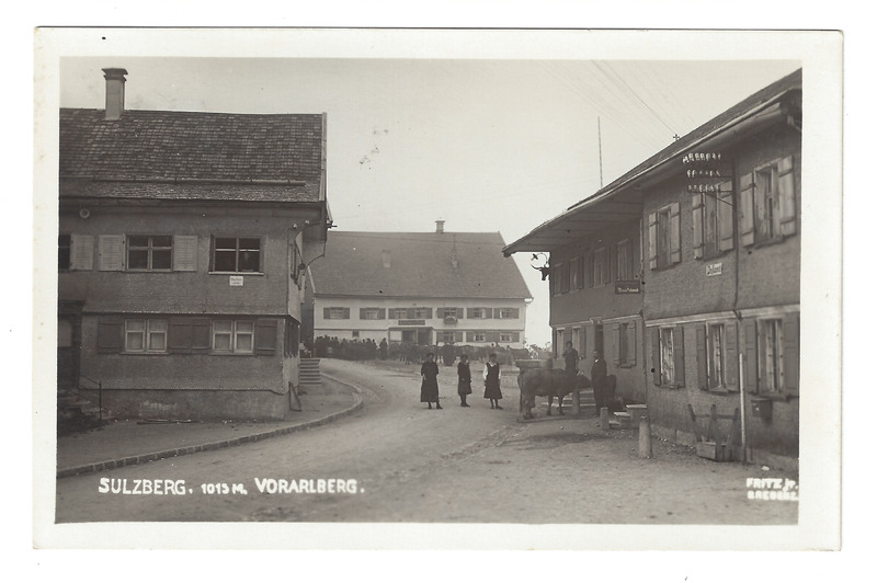 - Postkarte; schwarz-weiße Fotografie von Sulzberg; das Haus ganz rechts ist als Postamt beschildert; Das Foto ist beschriftet mit "SULZBERG, 1013 M, VORARLBERG." und wurde von Fritz jr. Bregenz erstellt; Die Karte wurde abgestempelt in Bregenz-Bezau am 1933-02-02