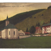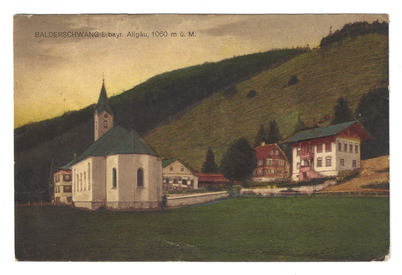 - Postkarte; bunte Zeichnung von Balderschwang (Kirche und vier Häuser); betitelt mit "Balderschwang i. bayr. Allgäu, 1060 m ü. M."; 2-Kronenbriefmarke von Deutschösterreich