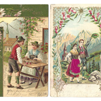 02: Die geprägte bunte Karte zeigt eine Zeichnung eines Paares in Trachtenkleidung, das vor einer Kirche in den Bergen steht; Auf die Schürze der Frau ist ein Stück pinker Stoff aufgeklebt; Die Karte ist mit Bleistift geschrieben und sehr schwer zu lesen.