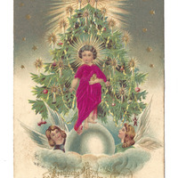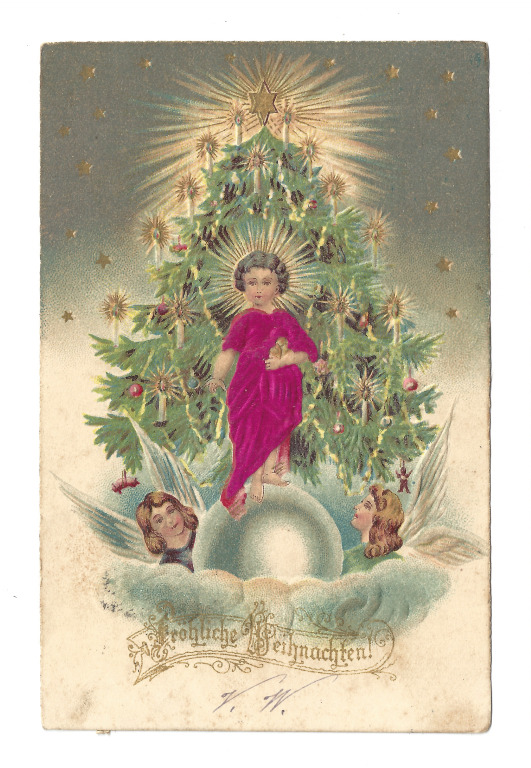 bunte geprägte Karte, die einen geschmückten Christbaum abbildet, vor dem zwei Engel und das Christuskind sind; Das Kleid des Christuskindes ist mit pinkem Stoff beklebt; Die Karte ist abgestempelt in Dornbirn; 5-Heller-Briefmarke.
