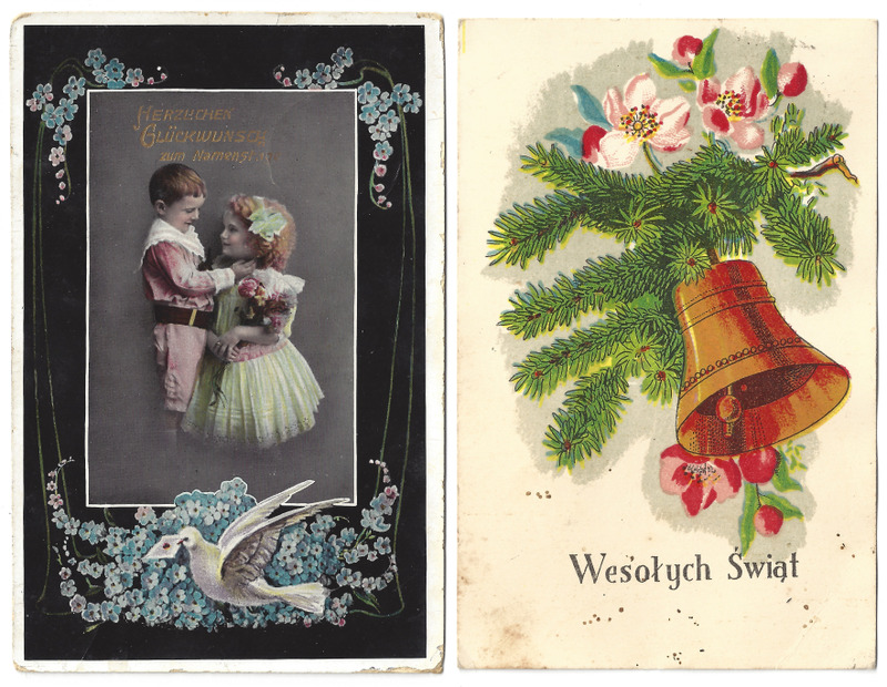 03: Die Karte hat ein nachcoloriertes Foto von zwei Kindern aufgedruckt, das von Blumen und einer Brieftaube umrahmt ist; Es steht in Gold "Herzlichen Glückwunsch zum Namenstage" darüber; Die Karte wurde vermutlich in Doren am 12.06.1911 abgestempelt.