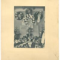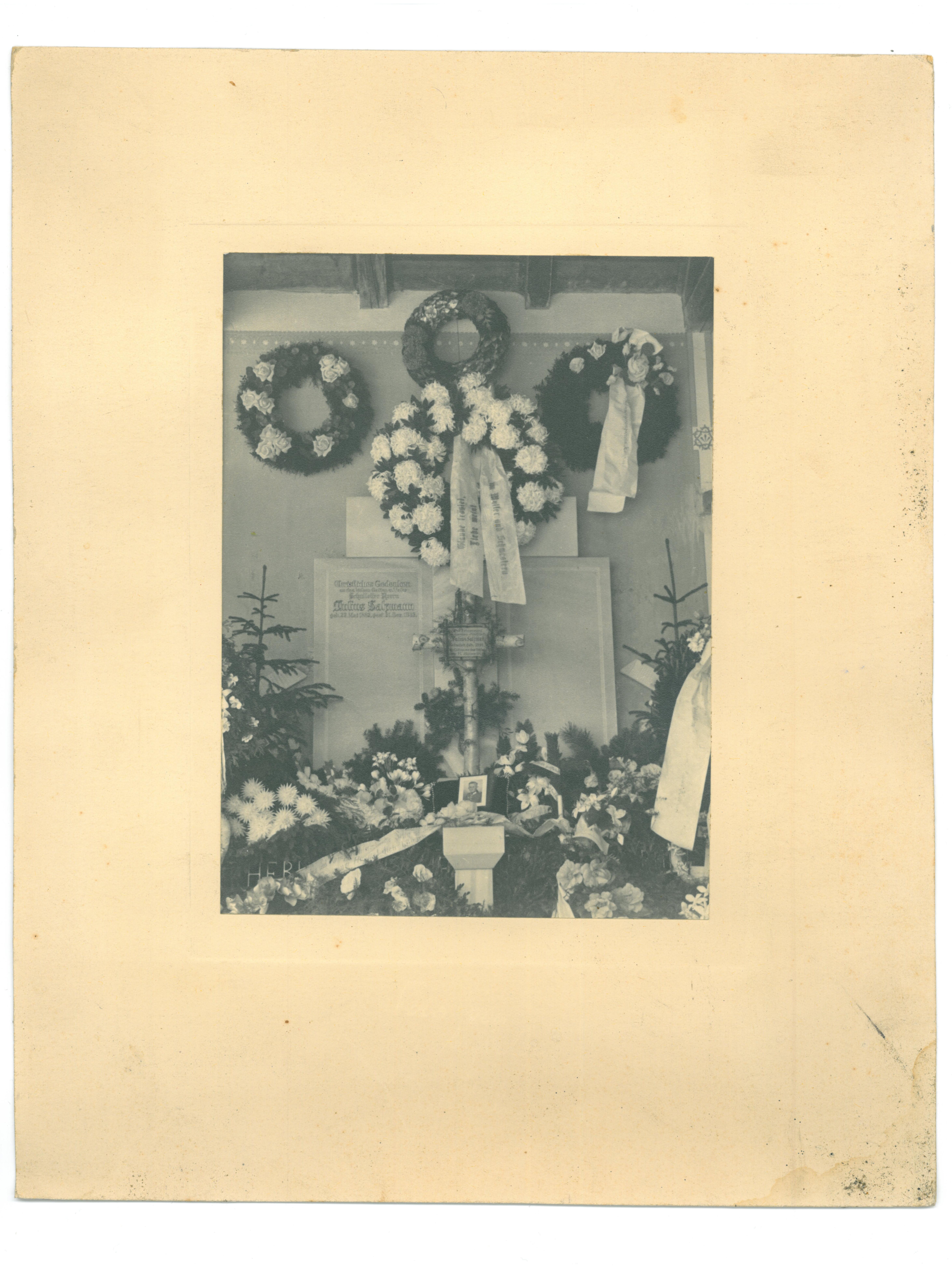 - Die Aufbahrung von Julius Salzmann (Schulleiter) am Friedhof; der cremefarbene Papierhintergrund ist teilweise verschmutzt.