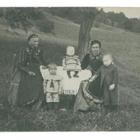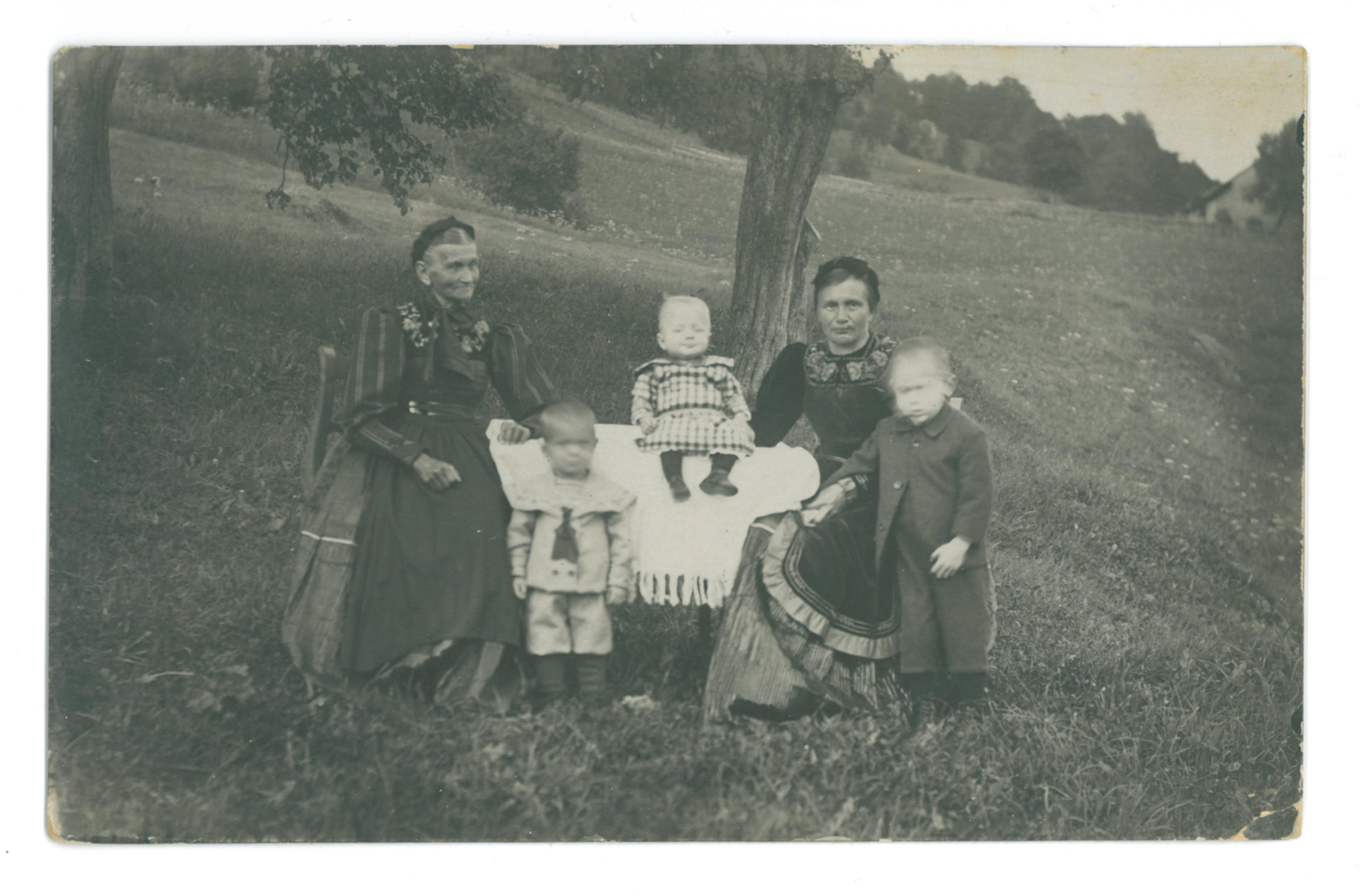 2 Frauen in der Bregenzerwälder Tracht sitzen auf zwei Stühlen links und rechts von einem Tisch; Auf dem Tisch, auf dem weißen Tischtuch, sitzt ein Kleinkind, das ein Kleid trägt; davor steht ein kleiner Junge und rechts neben der einen Frau ein weiterer Junge; Eventuell Großmutter, Mutter und Enkel?