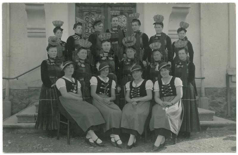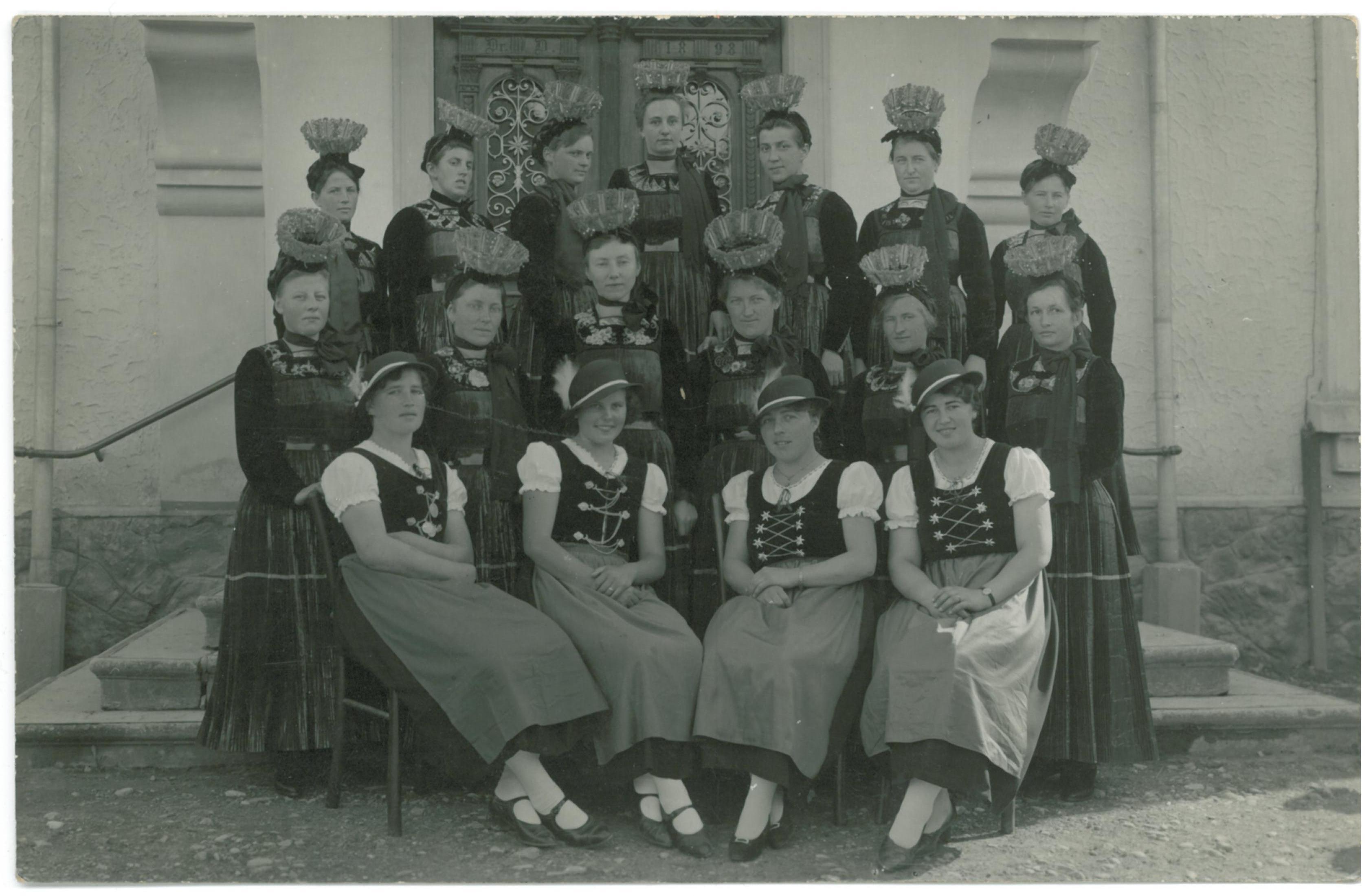 - 17 Frauen wurden abgelichtet; die vordersten 4 sitzen auf Stühlen und tragen Dirndl; die anderen 13 tragen die Bregenzerwälder Tracht mit einem "Schappele".